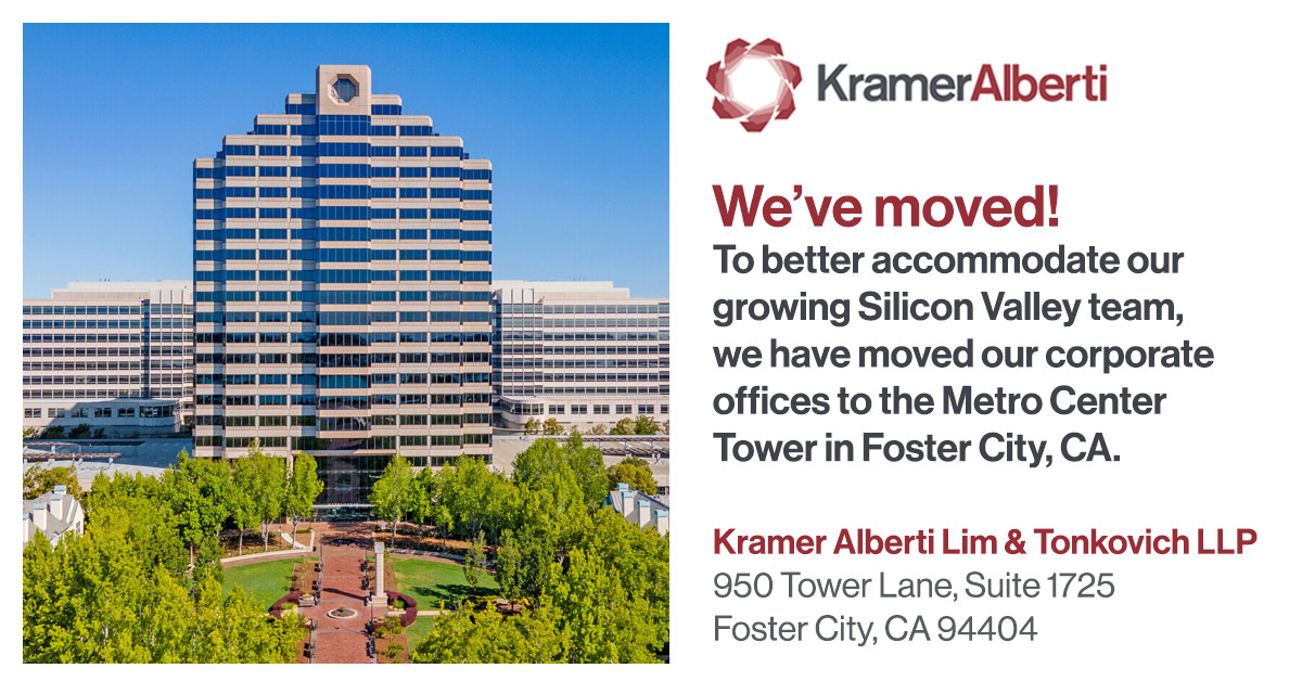 Kramer, Alberti, Lim & Tonkovich, LLP has moved its corporate headquarters and Silicon Valley team to the Metro Center Tower complex in Foster City, CA. The move from the firm’s most recent office in Burlingame was made to accommodate Kramer Alberti’s rapidly growing Silicon Valley legal and technical advisory team.