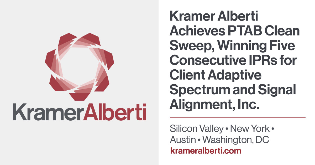Kramer Alberti recorded a clean sweep for client Adaptive Spectrum and Signal Alignment, Inc. (“ASSIA”), winning denial of institution of all five inter partes review petitions (“IPRs”) filed by Charter Communications’ challenges of the validity of ASSIA’s foundational patents. The IPRs are captioned in the Patent Office PTAB as Charter Communications, Inc. v. Adaptive Spectrum and Signal Alignment, Inc.