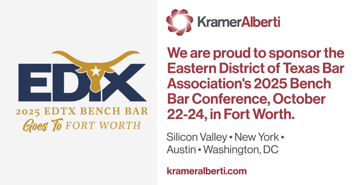 Kramer Alberti has announced it will sponsor the Eastern District of Texas Bar Association’s 2025 Bench Bar Conference, October 22-24, in Fort Worth, TX. The ED Tex Bench & Bar conference is attended by judges, lawyers, and notable speakers from across the country and is regarded as one of the top bench and bar conferences in the nation.
